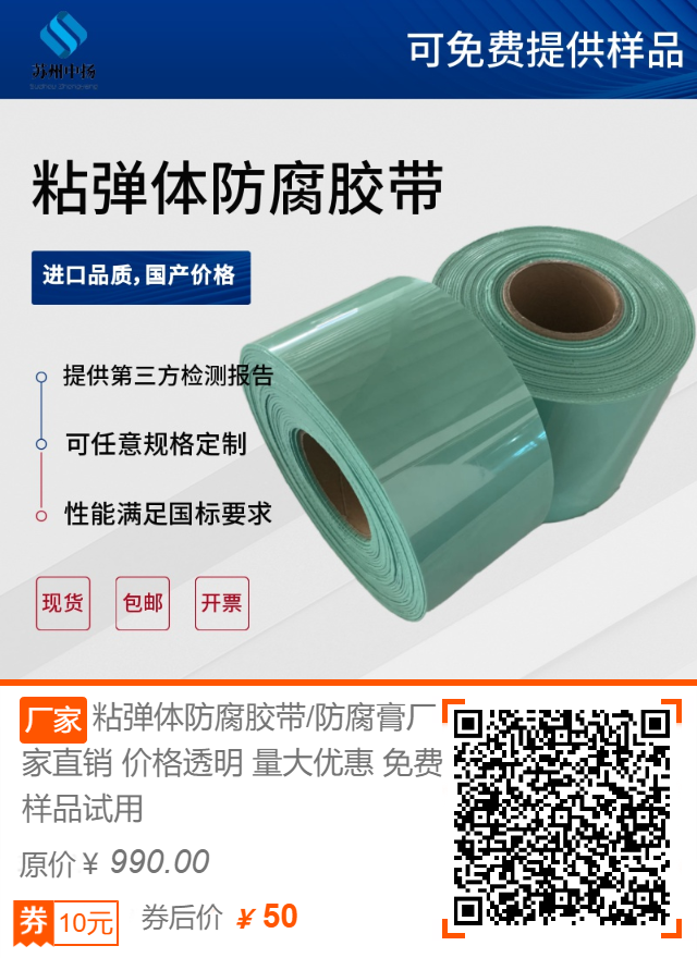 4.粘彈體防腐膠帶可以使用10公分或15公分為宜。手動纏繞粘彈體膠帶時,膠帶應(yīng)該有一定的變形能力,以保證搭接處不出現(xiàn)褶皺。